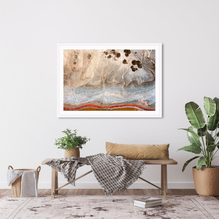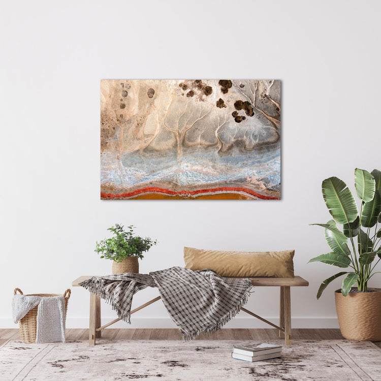 An unmanipulated photograph of the muddy banks of Cockajemmy Salt Lake in Victoria. A red ‘line’ of pigmentation sits below at the water’s edge shaped like a sine wave from a sound or a ‘song’. A ‘Songline’ with its contemporary dreaming story playing out above.